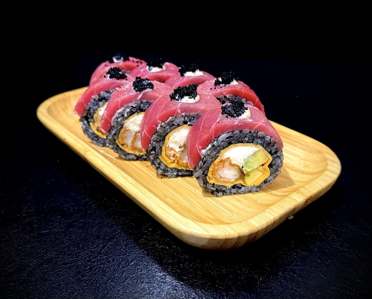 Магуро блек380 г8 штКреветка в паніровці, Чорнила каракатиці, Крем сир, Тунець, Горіховий соус, Сир-чедер, Авокадо, Масаго