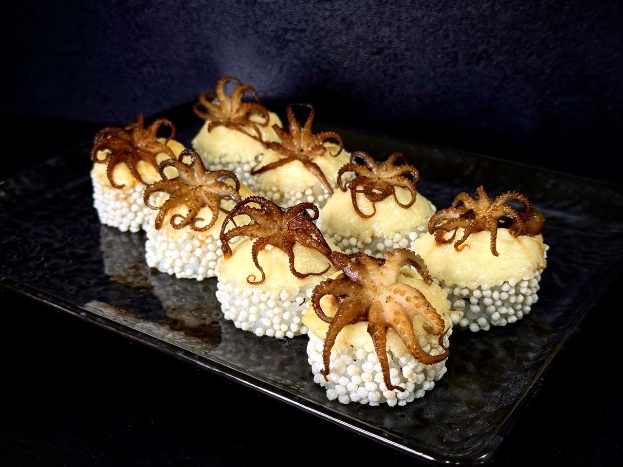 Запечений з восьминогом380 г8 штВосьменіг бебі, Рисові кульки, Крем сир, Краб, Пармезан, Огірок