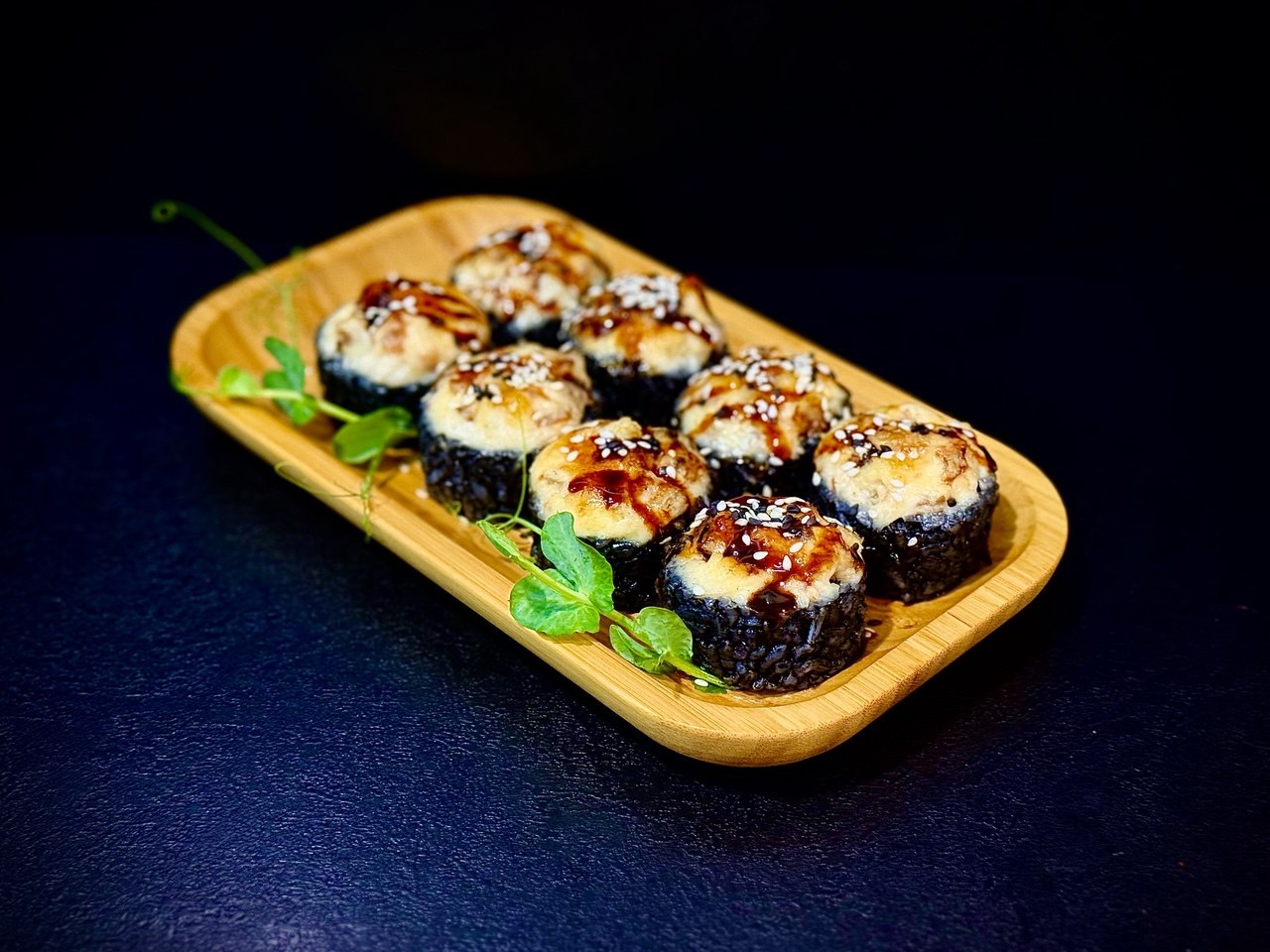 Запечений з вугрем та грушою320 г8 штГруша, Сир дорблю, Соус унагі, Чорнила каракатиці, Крем сир, Вугор, Пармезан, Кунжут